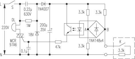报警器电路见图。图中检测电路采用电阻桥,储藏室门开关采用磁控开关,门关接通,门开断开,储藏室门开关与电桥的一个电阻构成电桥的一臂,安装在储藏室内。这样,若门被撬开,则磁控开关断开;又若外线被短接或者断路,无论哪种情况,都会使桥路失去平衡,A、B两端电压经整流桥的1N4148使光耦工作,从而使双向可控硅导通,电铃发出报警信号。