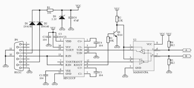RS232-485转换器主要包括了电源、232电平转换、485电路三部分。本电路的232电平转换电路采用了NIH232或者也可以直接使用MAX232集成电路,485电路采用了MAX485集成电路。为了使用方便,电源部分设计成无源方式,整个电路的供电直接从PC机的RS232接口中的DTR(4脚)和RTS(7脚)窃取。PC串口每根线可以提供大约9mA的电流,因此两根线提供的电流足够供给这个电路使用了。经实验,本电路只使用其中一条线也能够正常工作。使用本电路需注意PC程序必须使串口的DTR和RTS输出高电平,经过D3稳压后得到VCC,经过实际测试,VCC电压大约在4.7V左右。因此,电路中要说D3起的作用是稳压还不如说是限压功能。