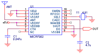 超外差电路的灵敏度和选择性都可以做得很好,美国Micrel公司推出的单片集成电路可完成接收及解调,其MICRF002为MICRF001的改进型,与MICRF001相比,功耗更低,并具有电源关断控制端。MICRF002性能稳定,使用非常简单。与超再生产电路相比,缺点是成本偏高(RMB35元)。下面为其管脚排列及推荐电路。