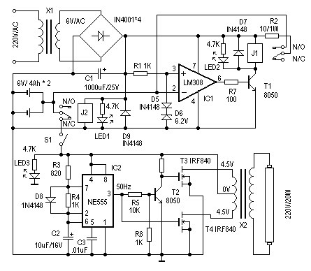 由IC2(NE555)、T2、T3、T4、X2等组成应急灯电路。IC2组成50Hz信号发生器,由IC2的3脚输出50Hz信号,经T2反相、放大分别驱动由T3、T4、X2组成的推挽电路,在X2的高压侧感应出220V的交流电,使日光灯管点亮。这里的X2可以直接使用次级为4.5伏、初级为220V的成品电源变压器,功率试日光灯管的功率而定。使用时,注意T3、T4应加散热器。