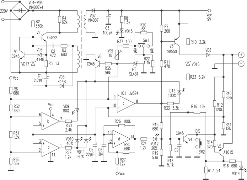 如果是为镍镉、镍氢电池充电,由于这类电池存在一定的记忆效应,需不定时对其进行放电。SW1是镍镉、镍氢、锂离子电池充电转换开关。SW1与精密基准电源SL431为运放LM324⑨提供两个不同的精密基准源,由SW1切换。在给镍镉、镍氢电池充电时,LM324⑨脚的基准电压约0.09V(空载);在给锂离子电池充电时,LM324⑨脚的基准电压约为0.08V(空载),这种设计是由这两种类型电池特有的化学特性决定的。按下SW2,V5基极瞬间得一低电平而导通,可充电池上的残余电压通过V5的ec极在R17上放电,同时放电指示灯VD14点亮。在按下SW2后会随即释放,这时可充电池上的残余电压通过R16、R13分压,C9滤波后为V4的基极提供一个高电平,V4导通,这相当于短接SW2。随着放电时间的延长,可充电池上的残余电压也越来越低,当V4基极上的电压不能维持其继续导通时,V4截止,放电终止,充电器随即转入充电状态。