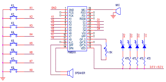 (2)并行地址接口: 在并行地址接口工作方式下,K1为同步时钟端,K2~K8为7位并行地址输入端,最大可分为27=128段。O1、O2位两种极性相反的忙信号输出,可由用户选择使用其中一条输出。作为忙信号,O1在播放语音时为高,放音完毕拉低;O2与其正好相反。 并行地址接口工作方式的电路如图5,工作时序如图6。 ![]() 图5 并行地址接口工作方式电路 ![]() 图6 并行地址接口工作方式时序图 (三)RESET时序 用单片机口线控制PM60的复位时,需要注意给完RESET管脚低信号后需要延迟300ms的时间,才能开始PM60的放音操作。放音操作,否则不能正常复位。 ![]() 图七 PM60的RESET时序 7. PM60的编程软件 PM60的编程软件的使用环境继承了PM50编程软件的风格,与PM50编程软件中“智能2代”工作方式类似,详细的使用方法请参阅PM50编程软件中“智能2代”部分的内容。其中略有改动的是,加入了“record”的设置以配合PM60可以接MIC录音的新功能。 8. PM60的MIC录音方式 PM60相对于PM50,除了在录音时间上有所增加,而且增加了MIC录音的功能。使PM60芯片的使用更具有灵活性。需要PM60的MIC录音功能时,在下图中所示的下拉菜单中选择对应选项。 ![]() PM60的录音需要在编程软件上预先设置好录音存储的位置,如果采用按键操作模式,则选择存储在K1~K8端;如果采用微控制器操作模式,则选择存储在对应的地址。两种设置方式如下图所示: